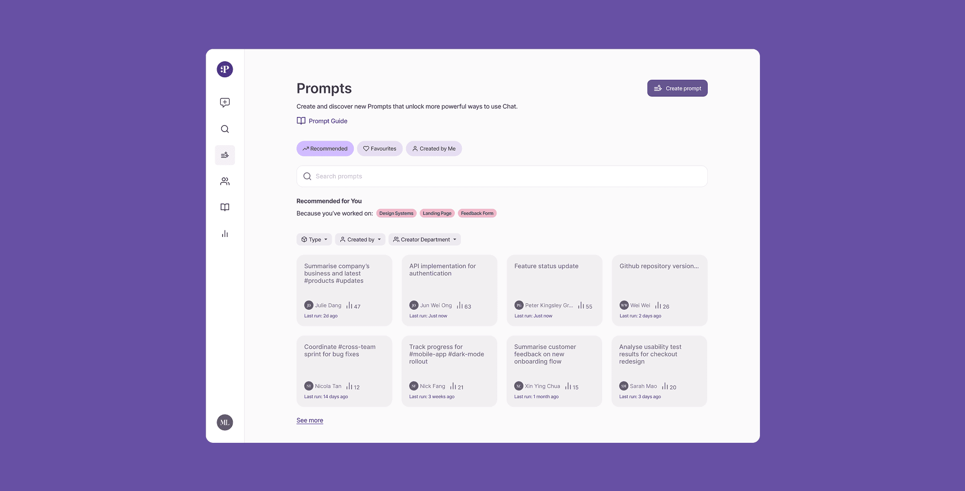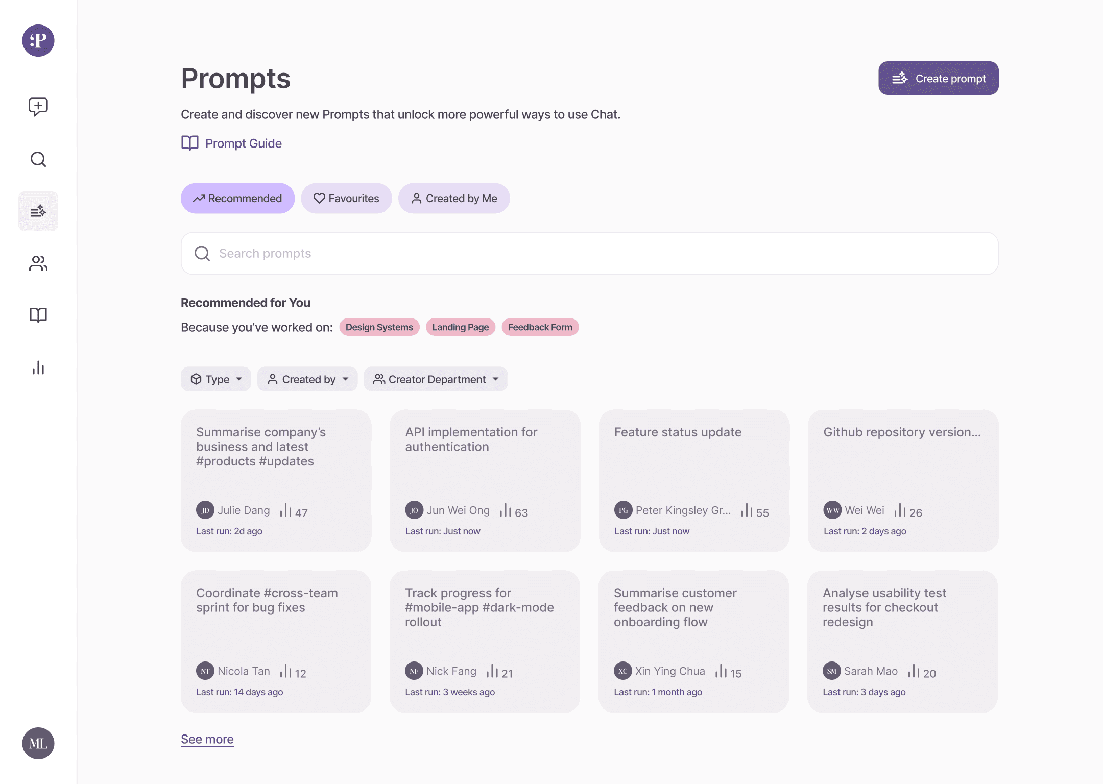 Users can browse and filter prompts by topic, department, or creator, making it easy to discover relevant workflows and reuse existing knowledge across teams.
