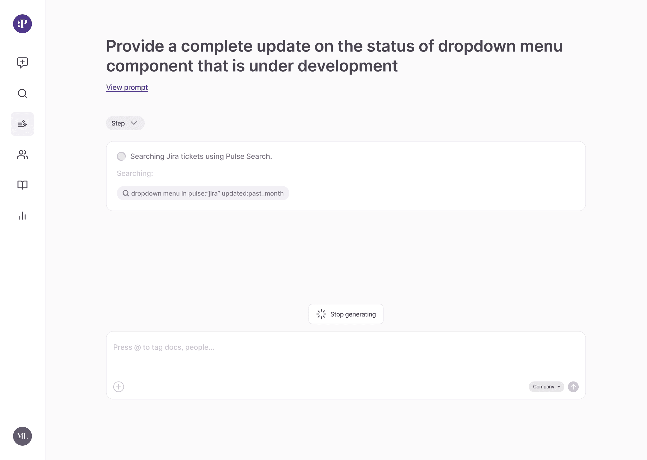 Pulse actively retrieving context from connected tools like JIRA, Figma, and Confluence, turning a simple prompt into a powerful way to uncover relevant, cross-functional knowledge without manual digging.
