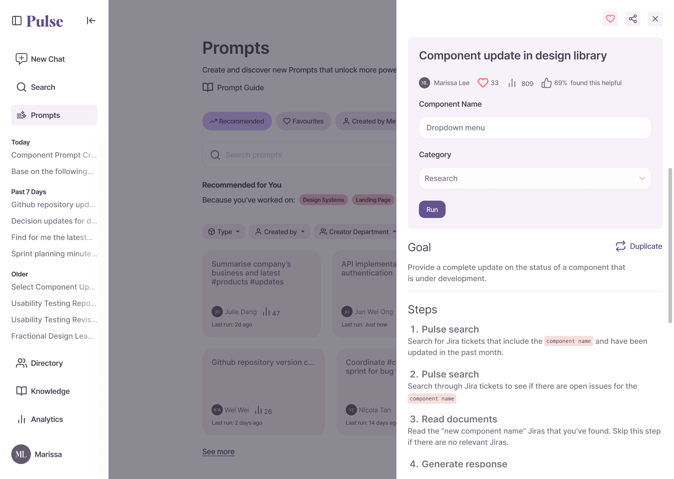 An example of a user who selected Marissa's prompt to find a component update in the design library. Prompt with specific details ensure the AI delivers more accurate, context-aware results tailored to their task.