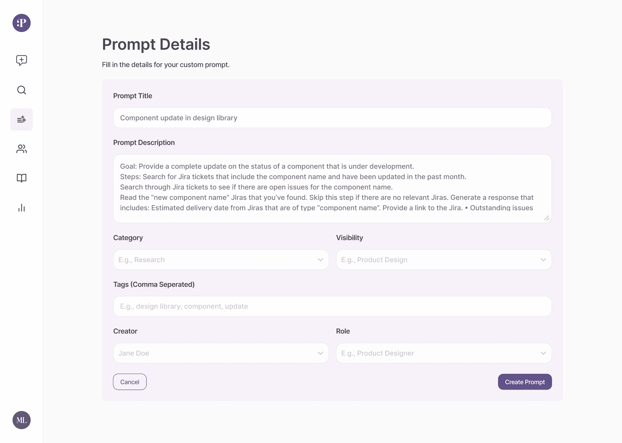 To create a new prompt, enter prompt details accordingly.